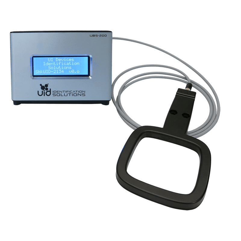 The RFID Microchip Reader Base Station (UBS-200-L) is a high-powered, industrial reader designed to read encoded data from all UID implantable microchips, including Temperature. This reader provides a read distance ranging from 4 to 8 cm, and it comes with a 6’ attachable antenna wand for increased scanning flexibility. The Microchip Reader Base Station has two antenna ports, an Internal and External Antenna port, which are switchable for easy microchip identification between different antenna types. The Microchip Reader Base Station connects to a computer system with a USB cable, and it is compatible with all software systems. The rugged aluminum housing provides increased durability, and it can be cleaned with most common laboratory cleaning agents without fear of damage. The RFID Base Station can also be used as a microchip programmer with the addition of the Pi Software Provisioning Application. Microchips can be programmed in the cannula prior to implantation, or in the animals after implantation. There is no need for special or additional equipment for programming.